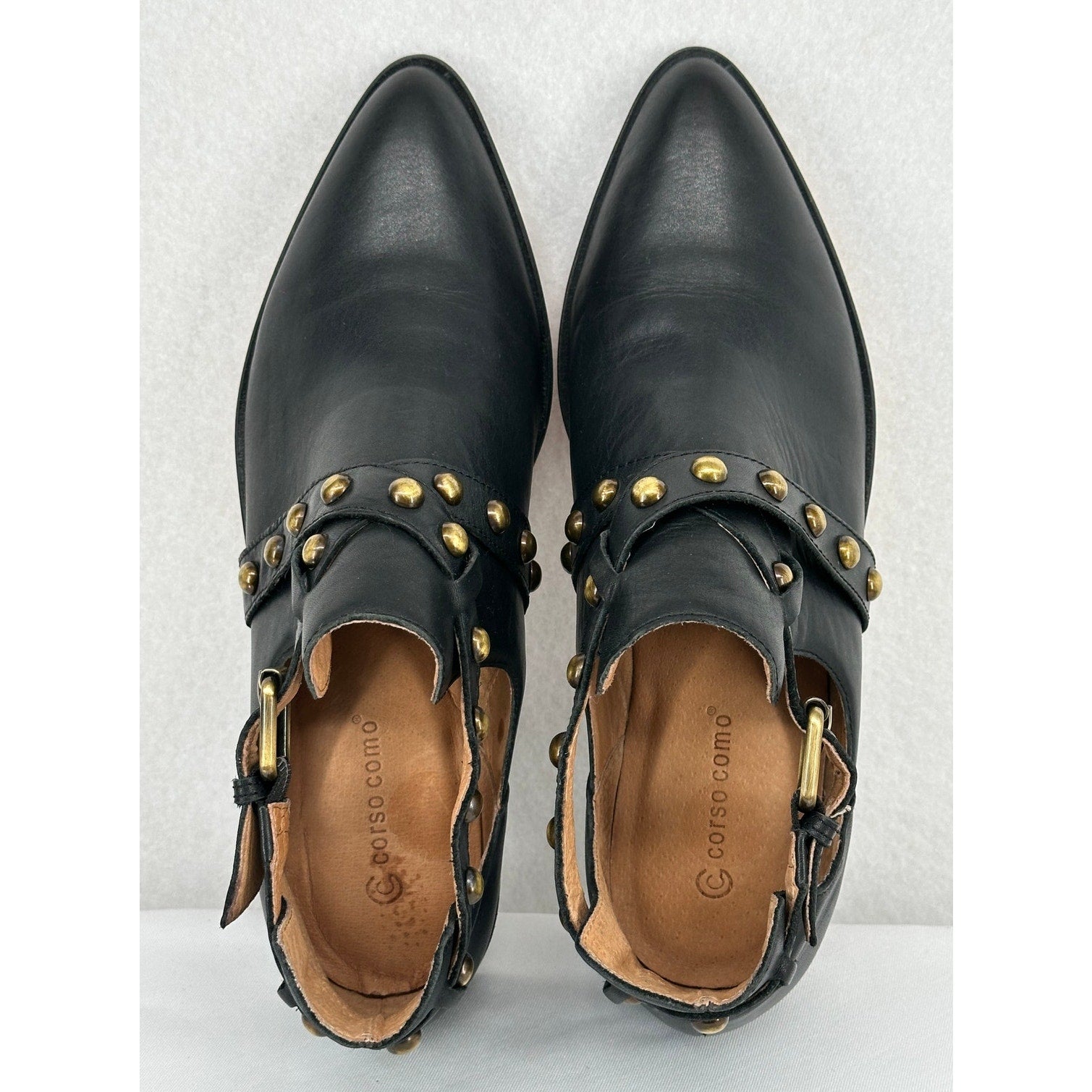 Step out in style with these Corso Como Doon ankle boots! Crafted from quality leather, these boots feature eye-catching studded detailing and a chic side buckle strap. The flat heel ensures all-day comfort, making them perfect for any occasion. In great condition and ready to elevate your wardrobe!
