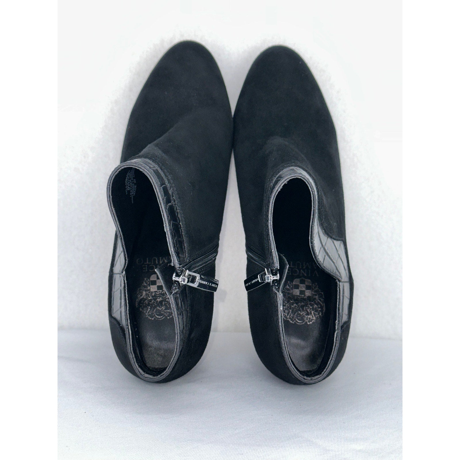 Step out in style with these Vince Camuto Larmana Black Leather Side Zip Heel Booties! These chic booties feature a sleek black leather design, a convenient side zip closure, and a comfortable heel for all-day wear. Perfect for adding a touch of sophistication to any outfit. Don't miss out on these must-have booties!